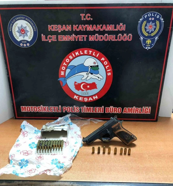 <div>Edirne’nin Keşan ilçesinde Emniyet Müdürlüğü ekiplerinin şüphe üzerine durdurduğu otomobilde ruhsatsız tabanca ele geçirildi.</div><div>Alınan bilgiye göre, Mustafa Kemal Paşa Mahallesi Zati Yörüker Caddesi’nde A.A. yönetimindeki otomobili durduran Keşan İlçe Emniyet Müdürlüğü ekipleri, otomobilde yaptıkları kontrolde, ruhsatsız tabanca, tabancaya ait şarjör ve tabancaya ait 44 dolu fişek ele geçirdi.</div><div>Gözaltına alınan şüpheli hakkında adli işlem başlatıldı.</div><div><b>Kaynak:</b> IHA</div>