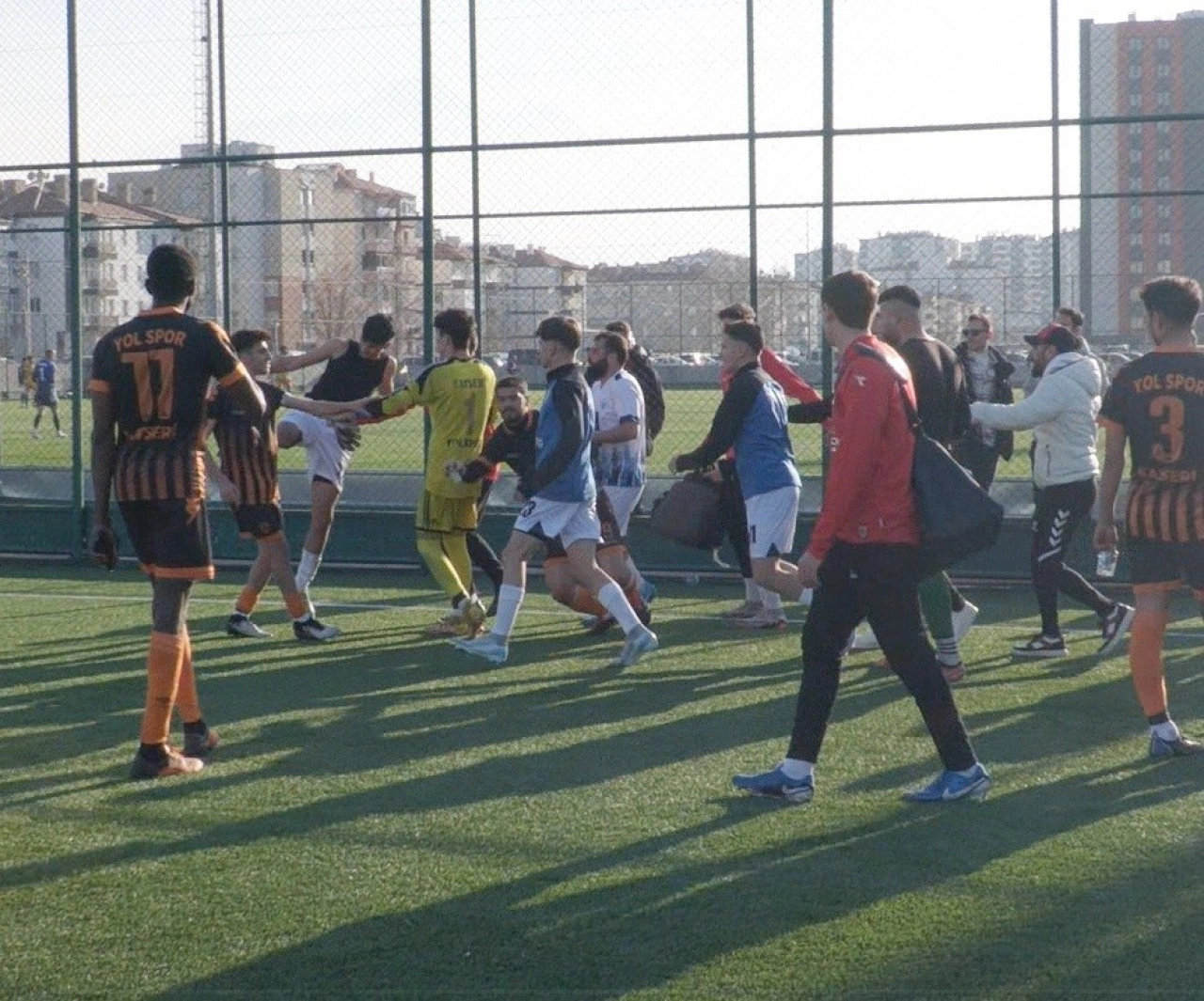 <div>Kayseri 1. Amatör Küme maçı sonrasında çıkan kavga polis tarafından güçlükle yatıştırıldı.</div><div>Kayseri 1. Amatör Küme A Grubu’nda Gazi Osman Paşaspor ile Yolspor karşı karşıya geldi. Şampiyonluk yarışı veren iki ekibin mücadelesinde kazanan 3-2 ile Yolspor oldu. Liderlik koltuğunda oturan ve son 2 haftaya girilirken 1 puan alması halinde şampiyonluğunu matematiksel olarak ilan edecek olan Gazi Osman Paşaspor, ikinci sırada bulunan Yolspor’a 3-2 yenilince maç sonrası istenmeyen olaylar meydana geldi. Önce hakeme itirazlarda bulunan ardından Yolsporlu futbolcular ile kısa süreli arbede yaşayan mavi-lacivertli ekibin futbolcuları, hem şampiyonluğunu ilan edemedi hem de bazı oyuncularının ceza almak adına Amatör Futbol Disiplin Kurulu’na sevk edilmesine sebebiyet verdi.</div><div>Yaşanan olaylar sonrasında Gazi Osman Paşaspor’dan Ahmet Çelik, Kasım Şahin, Hakan Yılmaz, Berat Koç ve Emirhan Demirezen, Yolspor’dan da Abdullah Budak Futbol Disiplin Kurulu’na sevk edildi.</div><div></div><div><b>Kaynak:</b> IHA</div>