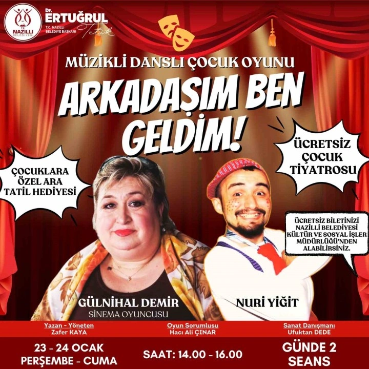 <div>Nazilli Belediyesi, ara tatilde çocuklara keyifli anlar yaşatmak amacıyla ücretsiz tiyatro bileti dağıttı.</div> <div></div> <div>Ünlü oyuncu Gülnihal Demir ve Nuri Yiğit’in sahne aldığı “Arkadaşım Ben Geldim” adlı müzikli ve danslı çocuk oyunu, 23-24 Ocak tarihlerinde sahnelenecek. Nazilli Belediyesi Mehmet Yüzügüler Kültür Merkezi Tiyatro Salonu’nda düzenlenecek oyun, 14.00 ve 16.00 saatlerinde iki seans olarak sahnelenecek. Eğlenceli müzikler ve rengarenk bir sahne tasarımıyla çocukların beğenisini kazanacak oyun, öğrencilere unutulmaz bir tatil hediyesi sunacak.</div> <div></div> <div>Tüm çocukları tiyatro oyunu izlemeye davet eden Nazilli Belediye Başkanı Dr. Ertuğrul Tetik; "Bu tür etkinliklerle çocuklarımızın sanata olan ilgisini artırmayı ve kültürel gelişimlerine katkı sağlamayı hedefliyoruz. Çocuklarımıza hem eğlenceli hem de eğitici bir tatil hediyesi olacak bu oyuna herkesi bekliyoruz" sözlerini kaydetti.</div> <div></div> <div><strong>Kaynak:</strong> IHA</div>