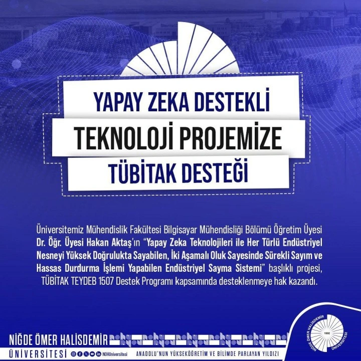 <div>Niğde Ömer Halisdemir Üniversitesi Mühendislik Fakültesi Bilgisayar Mühendisliği Bölümü Öğretim Üyesi Dr. Öğr. Üyesi Hakan Aktaş’ın yürütücüsü olduğu ’Yapay Zeka Teknolojileri ile Her Türlü Endüstriyel Nesneyi Yüksek Doğrulukta Sayabilen, İki Aşamalı Oluk Sayesinde Sürekli Sayım ve Hassas Durdurma İşlemi Yapabilen Endüstriyel Sayma Sistemi’ isimli projesi; TÜBİTAK TEYDEB 1507 destek programı kapsamında desteklenmeye hak kazandı.</div><div>Proje, Yapay zeka teknolojileri kullanılarak endüstrideki her boyutta ve çeşitteki nesnelerin (tohum, somun, vida, ilaç, direnç, kapasitör ve maden) yüksek hız ve doğrulukla saydırılmasını hedefliyor. Proje, başarıyla tamamlandığında, yapay zeka destekli bu yenilikçi teknoloji, Niğde’den dünyaya yayılarak endüstriyel süreçlere hız ve doğruluk kazandıracak. Proje yürütücüsü Dr. Öğr. Üyesi Hakan Aktaş projenin önemine dikkat çekerek; “Projemiz tamamlandığında, yapay zeka ile hassas saydırma işlemi yapabilen dünyanın ilk makinesini geliştirerek endüstrideki verimliliği artırmayı hedefliyoruz. Bu yenilikçi çalışmayı, Niğde Teknopark bünyesinde hayata geçirerek hem üniversitemize hem de ülkemize katma değer sağlamayı amaçlıyoruz.” dedi.</div><div>Niğde Ömer Halisdemir Üniversitesi Rektörü Prof. Dr. Hasan Uslu ise projenin ulusal ve uluslararası önemine dikkat çekerek Aktaş ve ekibini tebrik etti. Rektör Uslu açıklamasında; “Üniversitemiz, bilim ve teknolojide öncü projelere imza atmaya devam ediyor. TÜBİTAK tarafından desteklenen bu proje, sadece bölgemiz ve ülkemiz için değil, dünya çapında bir ilk olma özelliği taşıyor. Dünya’da ilk kez yapay zeka destekli hassas saydırma işlemi gerçekleştirebilecek bir teknolojinin geliştirilmesi, üniversitemizin bilimsel gücünü ve vizyonunu ortaya koymaktadır. Proje yürütücüsü Dr. Hakan Aktaş ve ekibini yürekten kutluyor, çalışmalarında başarılar diliyorum.” İfadelerine yer verdi.</div><div><b>Kaynak:</b> IHA</div>