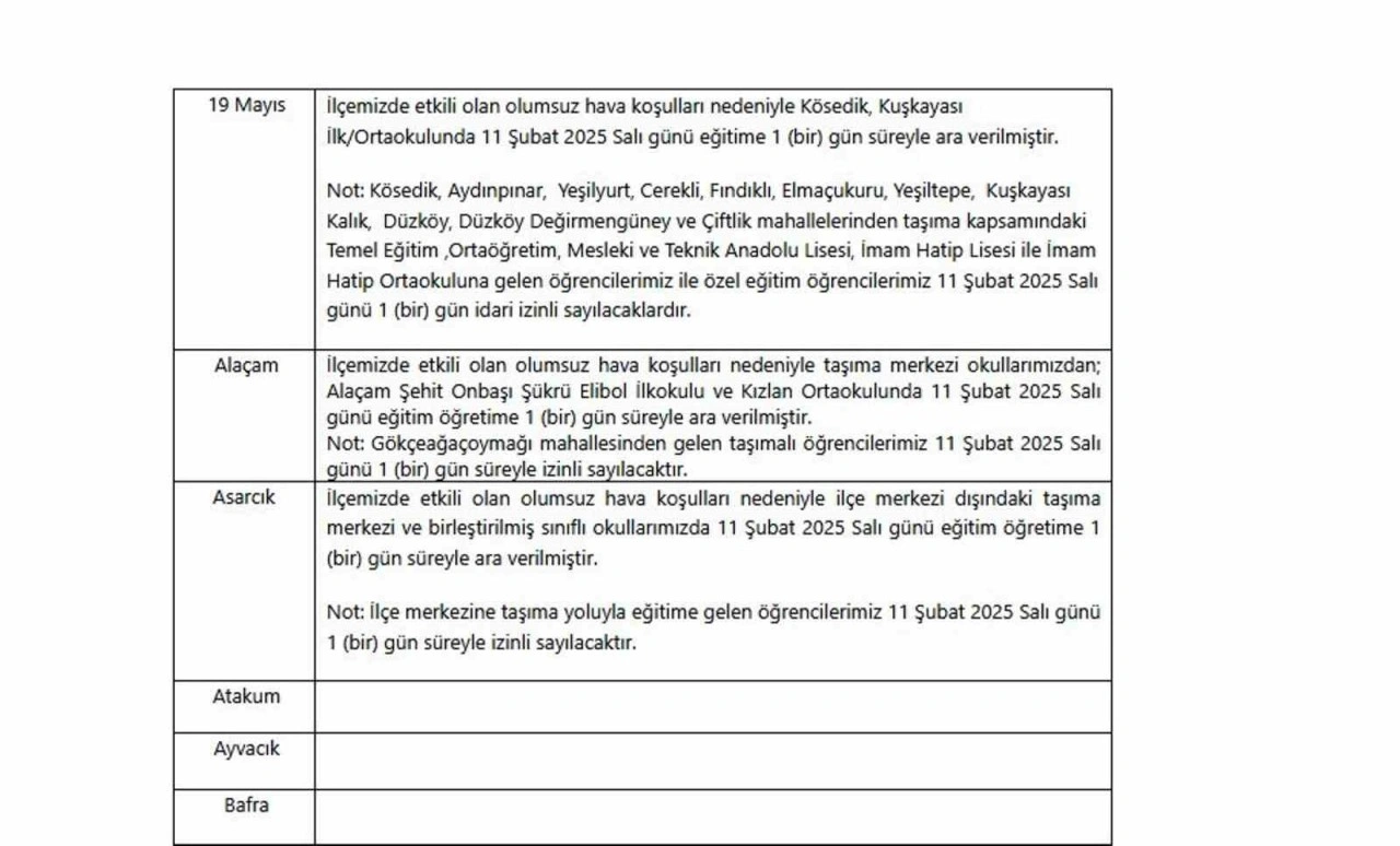 <div>İl Milli Eğitim Müdürlüğü, olumsuz hava şartları nedeniyle 11 Şubat Salı günü 19 Mayıs, Alaçam, Asarcık, Çarşamba, Ladik ve Salıpazarı ilçelerinde bazı okullarda eğitim-öğretime 1 gün süreyle ara verildiğini açıkladı. 19 Mayıs ilçesinde Kösedik Kuşkayası İlk ve Ortaokulunda eğitime 1 gün süreyle ara verildiği; Kösedik, Aydınpınar, Yeşilyurt, Cerekli, Fındıklı, Elmaçukuru, Yeşiltepe, Kuşkayası Kalık, Düzköy, Düzköy Değirmengüney ve Çiftlik mahallelerinden taşıma kapsamındaki temel eğitim, ortaöğretim, Mesleki ve Teknik Anadolu Lisesi, İmam Hatip Lisesi ile İmam Hatip Ortaokulu’na gelen öğrenciler ve özel eğitim öğrencilerinin ise 1 gün idari izinli sayılacağı belirtildi.</div> <div>Alaçam ilçesindeki Şehit Onbaşı Şükrü Elibol İlkokulu ve Kızlan Ortaokulu’nda eğitime ara verilirken, Gökçeağaçoymağı Mahallesi’nden gelen taşımalı öğrencilerin izinli sayılacağı kaydedildi.</div> <div>Asarcık ilçesinde ilçe merkezi dışındaki taşıma merkezi ve birleştirilmiş sınıflı okullarda eğitim öğretime ara verildiği, ilçe merkezine taşıma yoluyla eğitime gelen öğrencilerin de izinli sayılacağı belirtildi.</div> <div>Çarşamba ilçesinde Gülören İlkokulu’nda eğitime ara verildiği, taşımalı sistemle Yeşilalan, Yeşildere, Deyincek ve Selimiye mahallelerinden okula gelen öğrencilerin de izinli sayılacağı ifade edildi.</div> <div>Ladik ilçesinde tüm resmi, özel, örgün ve yaygın eğitim kurumlarında eğitim-öğretime 1 gün süreyle ara verilirken, Salıpazarı ilçesinde Konakören, Tahnal İlk ve Ortaokulu’nda eğitim öğretime 1 gün süreyle ara verildiği, aynı bölgelerden ilçe merkezine gelen taşımalı öğrencilerin de izinli sayılacağı kaydedildi.</div> <div>Ayrıca eğitime ara verilen okul ve ilçelerin isimlerinin hava şartlarına göre güncelleneceği ifade edildi.</div> <div></div> <div></div> <div><strong>Kaynak:</strong> IHA</div>