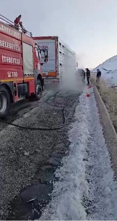 <div>Sarıkamış’ta hareket halindeki tırın lastiği patladı. Lastiği patlayan ve alev alan tır, itfaiye ekiplerinin müdahalesiyle yanmaktan son anda kurtuldu.</div><div>Edinilen bilgilere göre, Bursa’dan Kars’a yük taşıyan 12 AAJ 698 plakalı tırın, Sarıkamış Karakurt mevkii Mescitli köyü bölgesinde lastiği patladı. Lastiği patlayan tırdan biranda dumanlar yükselmeye başladı.</div><div>Olay yerine itfaiye ekipleri sevk edildi. Bölgeye gelen itfaiye ekiplerinin müdahalesiyle yanan tır söndürüldü. Olay ile ilgili tahkikat başlatıldı.</div><div></div><div><b>Kaynak:</b> IHA</div>