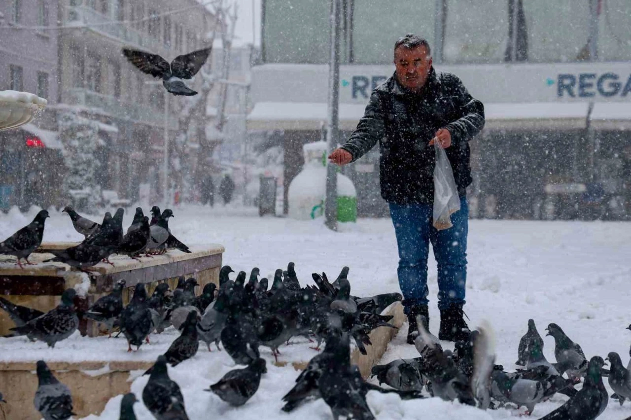 <div>Sakarya’nın Kocaali ilçesinde kıraathane işletmecisi, yoğun kar yağışı sebebiyle yiyecek bulmakta zorlanan güvercinleri elleriyle besledi.</div><div>Şehrin yüksek rakımlı bölgelerinde kar kalınlığı yer yer 20 santimetreye ulaşırken, dün gece saatlerinden itibaren Kocaali ilçe merkezinde de kar yağışı etkili oldu. İlçe merkezinde kar kalınlığı 10 santimetrenin üzerine çıkarken, 15 Temmuz Zafer Meydanı da beyazı büründü. Soğuk havada yiyecek bulmakta zorlanan güvercinlerin imdadına ise kıraathane işletmecisi Mustafa Gül yetişti. Güvercinleri her gün buğday ile besleyen Gül, "Sokakta yaşayan dostlarımızın sağlıklı bir şekilde yaşamaları için onları bu havalarda korumamız gerekiyor. Bu konuda duyarlı olmak lazım. Kış mevsiminde vatandaşlarımız bile donduğuna göre onları da düşünmemiz gerekiyor" dedi.</div><div></div><div><b>Kaynak:</b> IHA</div>
