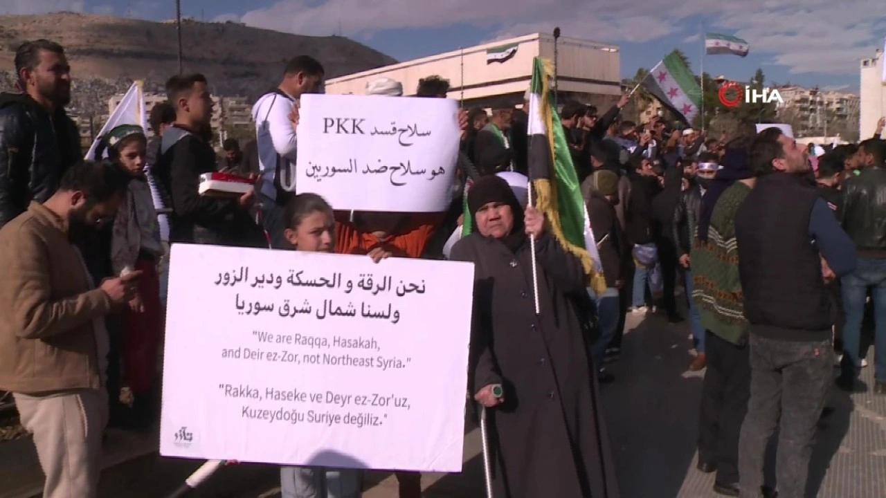 <div>Suriye’de Esad rejiminin devrilmesinin ardından yeni Devlet Başkanı Ahmed eş-Şara, ülkede birlik, beraberlik ve huzur mesajları veriyor. Ülkede herhangi bir terör örgütüne izin verilmeyeceği yönünde açıklamalar gelirken, başkent Şam’da bugün terör örgütleri protesto edildi.</div><div>Emevi Meydanı’nda toplanan Suriyeliler, attıkları sloganlarla terör örgütü PKK/YPG ve Suriye Demokratik Güçleri’ne tepki gösterdi.</div><div>Eylemde göstericiler, "PKK, Suriyelilere doğrultulan bir silahtır", "Biz Kuzeydoğu Suriye değil; Rakka, Haseki ve Deyrizoruz", "PKK’nın ırkçılığı=Esad’ın ırkçılığı", "SDG, Esad’dan daha kötü" yazılı pankartlar taşıdı.</div><div><b>Kaynak:</b> IHA</div>