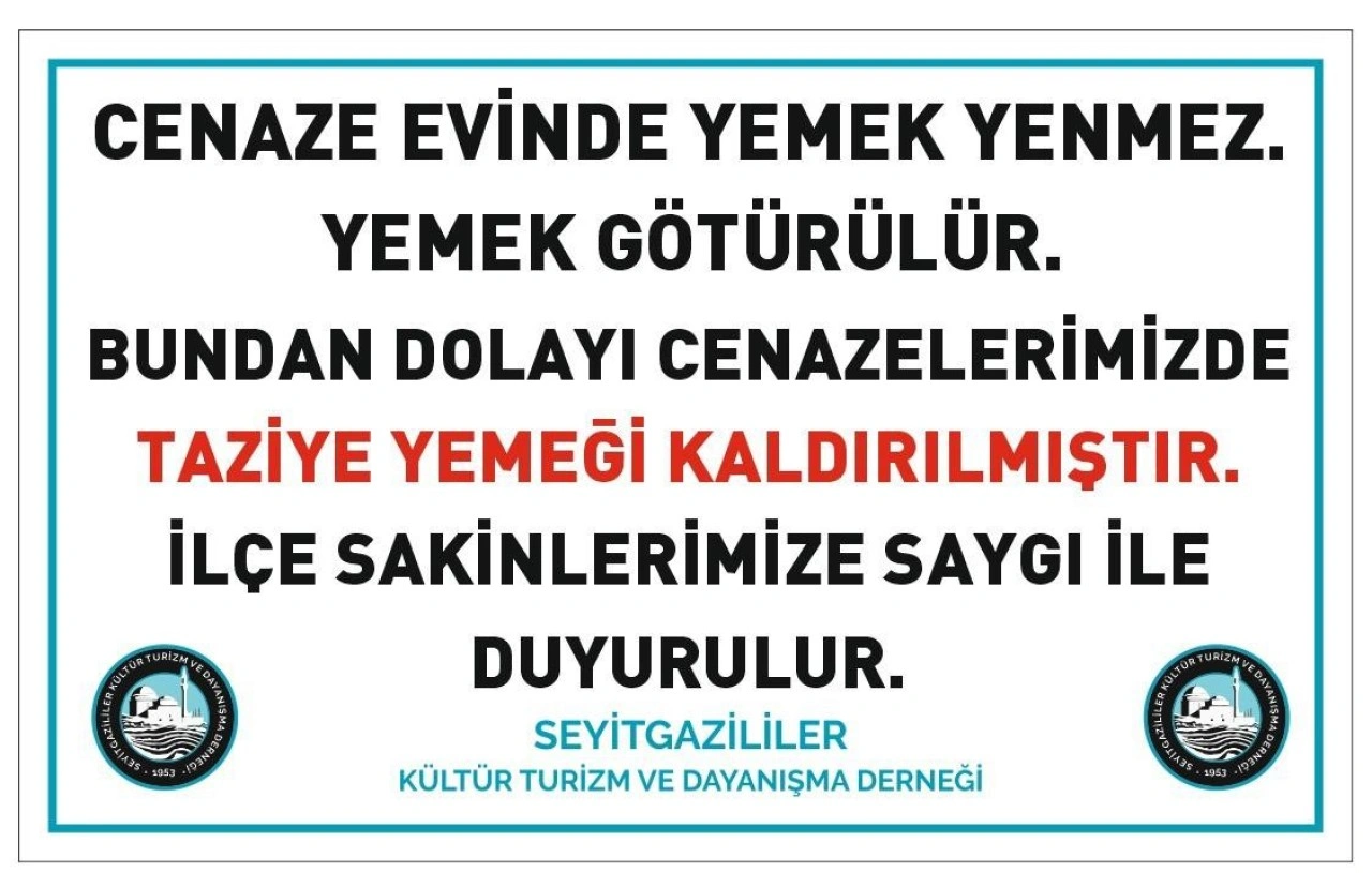 <div>Dernek yetkilileri tarafından konuyla ilgili yapılan açıklamada, "Cenaze evinde yemek yenmez, yemek götürülür. Bu kadim anlayışa ve Peygamber Efendimiz Hz. Muhammed (S.A.V)’in sünnetine uygun olarak, Seyitgazi’de taziye yemeği uygulaması kaldırılmıştır. Sünnete göre, vefat eden kişinin yakınlarına destek olmak amacıyla yemek yapmak ve götürmek tavsiye edilmiştir. Bu doğrultuda; cenaze sahibi aileden yemek ikramı beklenmemesi, aksine onların yükünü hafifletmek için destek olunması uygun görülmektedir. Bu hassasiyeti gözeterek, tüm Seyitgazili hemşehrilerimizin anlayışına ve desteğine sığınıyoruz" ifadeleri yer aldı.</div> <div></div> <div></div> <div><strong>Kaynak:</strong> IHA</div>