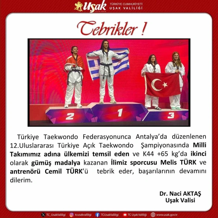 <div>Uşak Valisi Naci Aktaş, Türkiye Açık Taekwondo Şampiyonasında dereceye giren Uşaklı sporcu ve antrenörü için tebrik mesajı yayımladı.</div><div>Uşak Valisi Naci Aktaş, Türkiye Taekwondo Federasyonunca Antalya’da düzenlenen 12.Uluslararası Türkiye Açık Taekwondo Şampiyonasında dereceye giren Uşaklı sporcu Melis Türk ve antrenörü Cemil Türk için tebrik mesajı yayımladı.</div><div>Vali Aktaş yayımlamış olduğu mesajda; " Türkiye Taekwondo Federasyonunca Antalya’da düzenlenen 12.Uluslararası Türkiye Açık Taekwondo Şampiyonasında Milli Takımımız adına ülkemizi temsil eden ve K44 +65 kg’da ikinci olarak gümüş madalya kazanan İlimiz sporcusu Melis Türk ve antrenörü Cemil Türk’ü tebrik eder, başarılarının devamını dilerim." ifadelerini kullandı.</div><div><b>Kaynak:</b> IHA</div>
