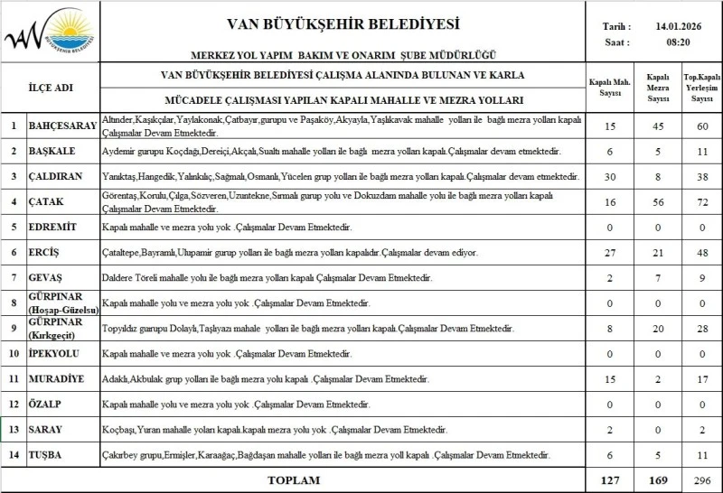 <div></div> <div>Van’da etkisini artıran kar yağışı ve tipi, kırsal bölgelerde ulaşımı olumsuz etkilemeye devam ediyor. Van Büyükşehir Belediyesi yol yapım, bakım ve onarım ekipleri, karla mücadele kapsamında kapalı mahalle ve mezra yollarında çalışmalarını sürdürüyor.</div> <div>Paylaşılan son verilere göre kent genelinde <strong>127 mahalle yolu</strong> ile <strong>169 mezra yolu</strong> olmak üzere toplam <strong>296 yerleşim yerinin yolu</strong> kar nedeniyle ulaşıma kapandı. Özellikle yüksek rakımlı ilçelerde kapanan yol sayısının dikkat çektiği bildirildi.</div> <div>Bahçesaray, Çaldıran, Çatak ve Erciş ilçeleri en fazla yolun kapalı olduğu bölgeler arasında yer alırken, Edremit, İpekyolu, Özalp ve Gürpınar’ın bazı bölgelerinde ise kapalı yol bulunmadığı belirtildi. Kırsal mahalleler ve mezralara ulaşımı yeniden sağlamak amacıyla iş makineleriyle kar temizleme ve yol açma çalışmaları devam ediyor.</div> <div>Yetkililer, önceliğin sağlık, acil durum ve ulaşım güvenliğine verildiğini belirterek, vatandaşlardan zorunlu olmadıkça kapalı güzergâhları kullanmamaları ve ekiplerin çalışmalarını engelleyecek davranışlardan kaçınmaları çağrısında bulundu.</div> <div>Karla mücadele çalışmalarının hava koşullarına bağlı olarak gün boyu süreceği ifade edilirken, yol durumlarıyla ilgili güncel bilgilerin ilgili birimler tarafından paylaşılacağı kaydedildi.</div> <h3>KAPALI OLAN MAHALLE VE MEZRA YOLLARI İSE ŞÖYLE;</h3> <div></div>