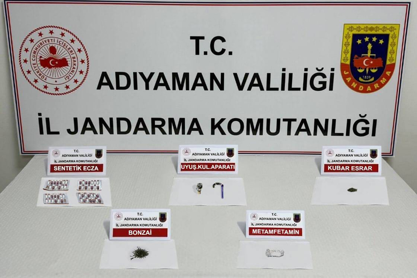 Adıyaman İl Jandarma Komutanlığı, 23 Aralık'ta il merkezi ve ilçelerinde uyuşturucu satıcı ve kullanıcılarına yönelik geniş çaplı operasyon gerçekleştirdi.Operasyon kapsamında; 95 gram bonzai, 56 adet sentetik ecza, 9 gram metanfetamin ve 5 gram kubar esrar ele geçirildi.