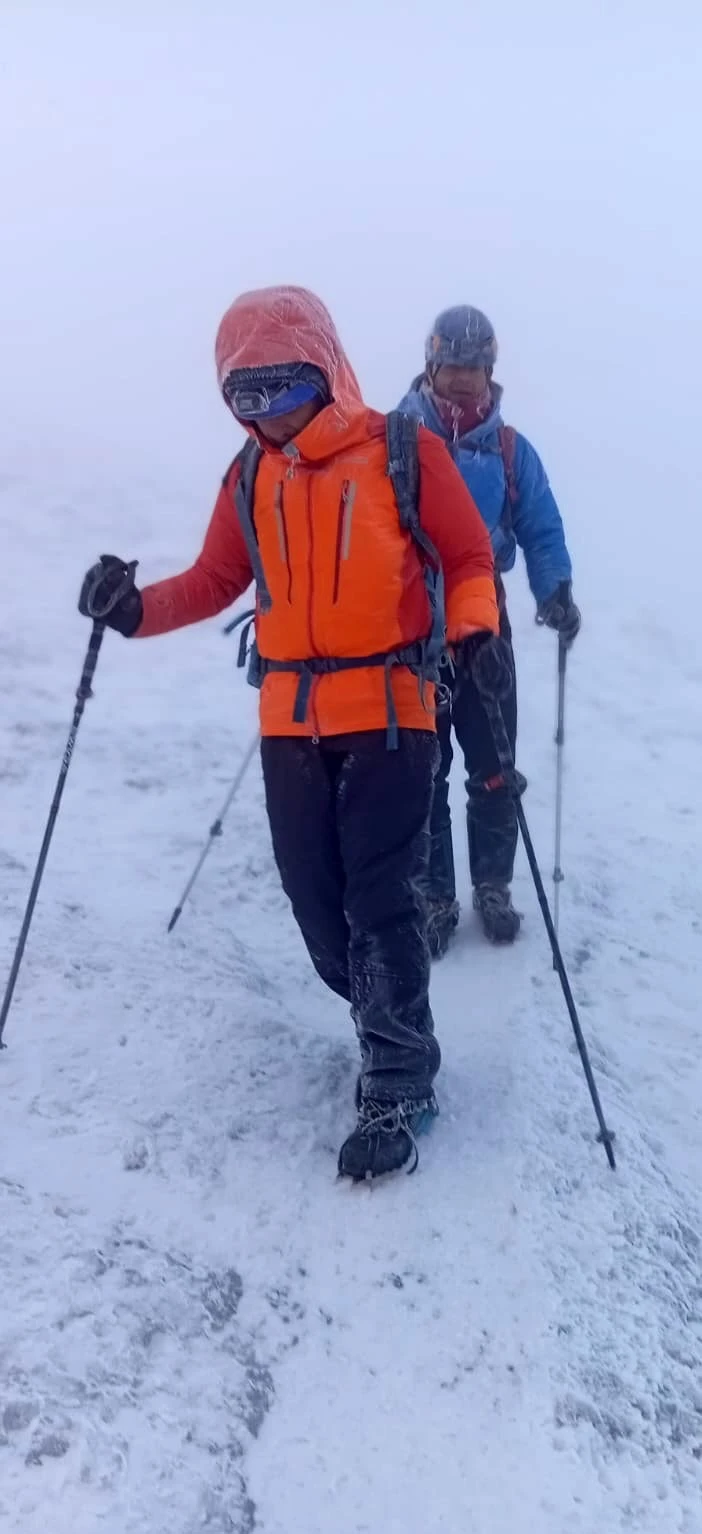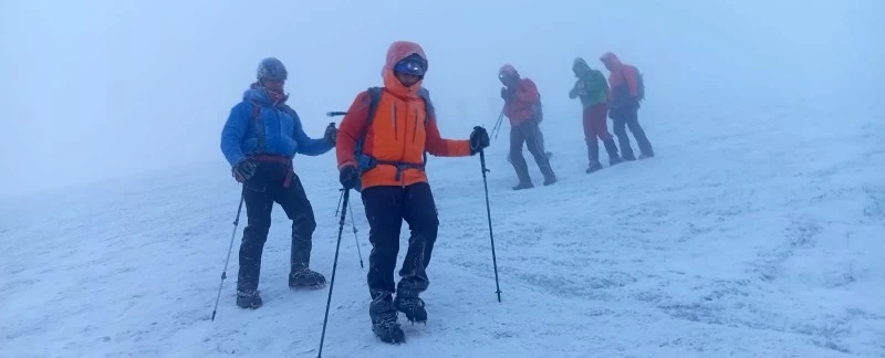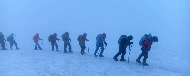 Tüm zorluklara rağmen tırmanışı bırakmayan dağcılar, rehberlerinin yönlendirmesiyle güvenlik protokollerini devreye alarak ilerledi. Kramponlar, batonlar ve ip sistemleriyle desteklenen ekip, doğanın zorlu koşullarına rağmen rotalarını terk etmeden zirveye ilerlemeye devam etti.