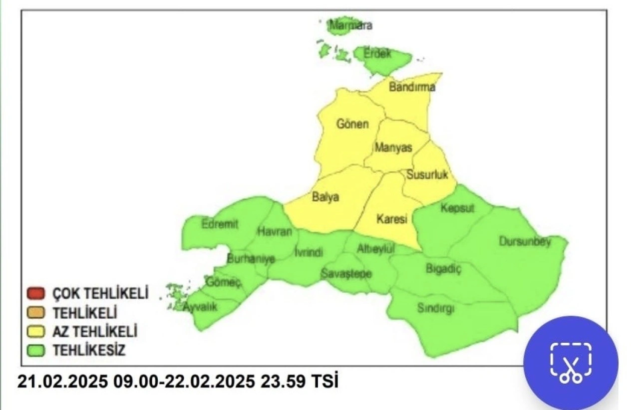 İzmir Bölge Tahmin ve Erken Uyarı Merkezi tarafından yapılan açıklamaya göre, Bandırma, Gönen, Manyas, Susurluk, Balya ve Karesi’nin kuzey kırsalında aralıklı olarak kar sağanakları görülecek.