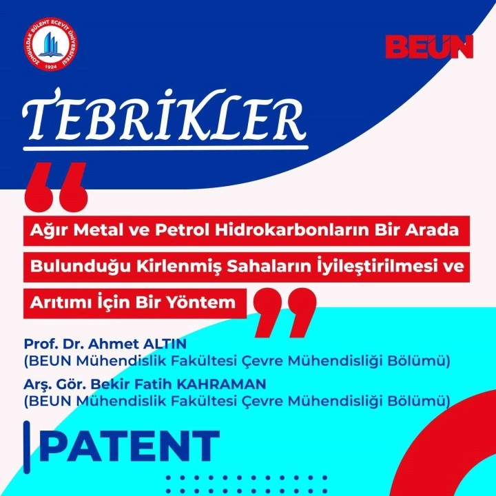 Zonguldak Bülent Ecevit Üniversitesi (BEUN) Mühendislik Fakültesi Çevre Mühendisliği Bölümü Öğretim Üyesi Prof. Dr. Ahmet Altın ve Arş. Gör. Bekir Fatih Kahraman’ın buluş sahibi olduğu "Ağır Metal ve Petrol Hidrokarbonların Bir Arada Bulunduğu Kirlenmiş Sahaların İyileştirilmesi ve Arıtımı İçin Bir Yöntem" başlıklı proje, patent almaya hak kazandı.
