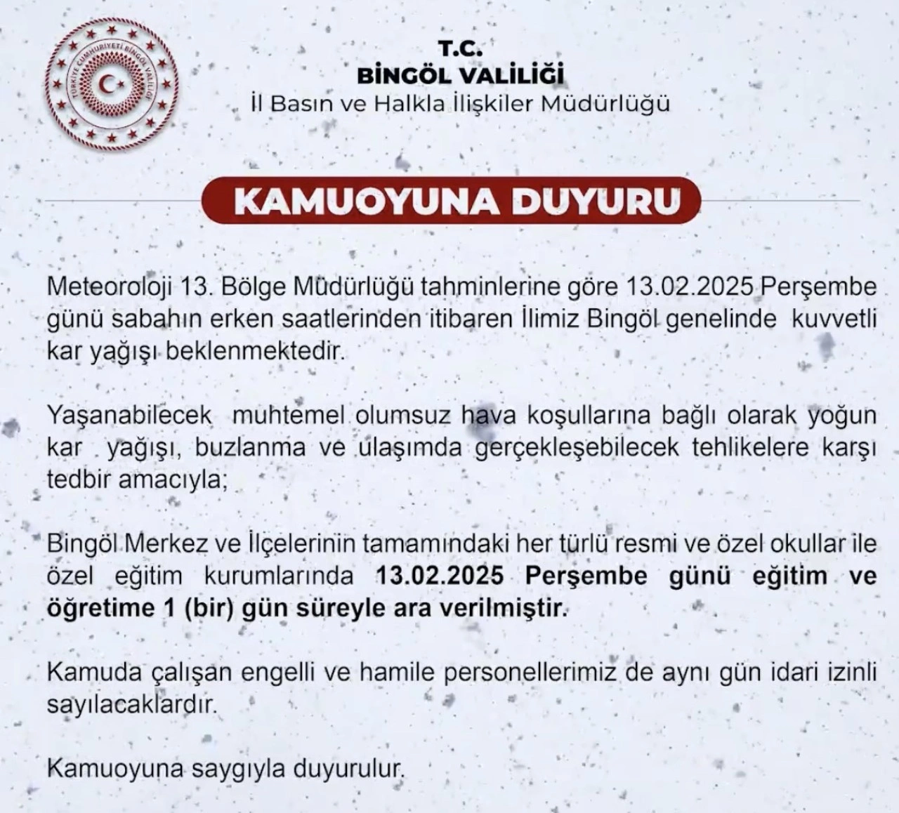 Bingöl Valiliği’nde yapılan açıklamada, "Meteoroloji 13. Bölge Müdürlüğü tahminlerine göre 13.02.2025 Perşembe günü sabahın erken saatlerinden itibaren İlimiz Bingöl genelinde kuvvetli kar yağışı beklenmektedir. Yaşanabilecek muhtemel olumsuz hava koşullarına bağlı olarak yoğun kar yağışı, buzlanma ve ulaşımda gerçekleşebilecek tehlikelere karşı tedbir amacıyla; Bingöl merkez ve İlçelerinin tamamındaki her türlü resmi ve özel okullar ile özel eğitim kurumlarında 13 Şubat 2025 Perşembe günü eğitim ve öğretime 1 gün süreyle ara verilmiştir. Kamuda çalışan engelli ve hamile personellerimiz de aynı gün idari izinli sayılacaklardır" denildi.