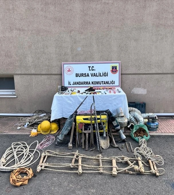 Bursa İl Jandarma Komutanlığı ekipleri, gelen ihbar üzerine bölgede geniş çaplı bir operasyon düzenledi. Kazı yaparken suçüstü yakalanan 9 şüphelinin üzerinde ve araçlarında yapılan aramalarda adeta bir cephanelik ele geçirildi.