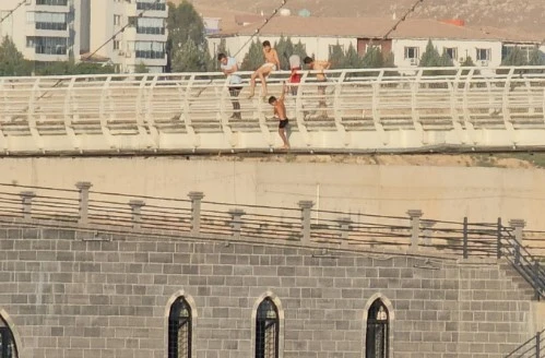 Şırnak'ın Cizre ilçesinde serinlemek isteyen çocuklar, İsmail Ebul-iz El Cezeri Köprüsüne çıkarak Dicle nehrine atladı. Tehlikeli oyun cep telefonu kamerasına yakalandı.