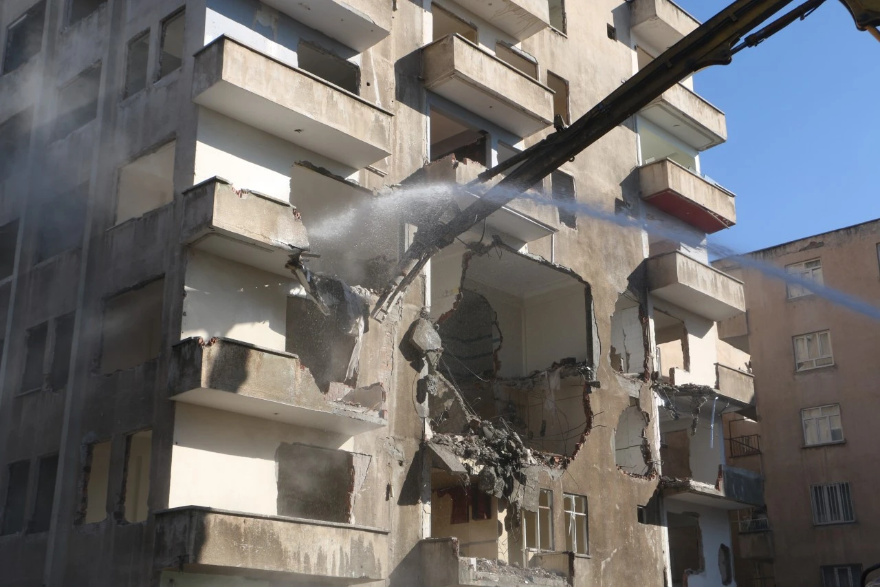 Diyarbakır'da, 6 Şubat 2023'te meydana gelen Kahramanmaraş merkezli depremlerden etkilenip ağır hasar alan binaların yıkımı devam ediyor.