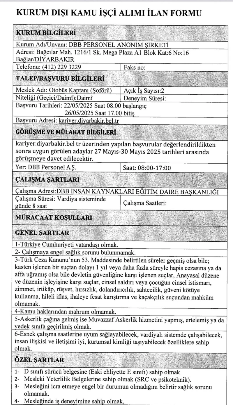 İşten çıkarma iddiaları gündemdeki yerini korurken, Diyarbakır Büyükşehir Belediyesi’nin yeni işçi alım ilanı dikkat çekti. Belediyenin yayımladığı ilana göre, Kamyon Şoförü (1), Halkla İlişkiler Görevlisi (12), Beden İşçisi (4), Formen (2), Otobüs Şoförü (2) ve Temizlik Görevlisi (4) olmak üzere toplam 25 kişilik yeni alım yapılacak.
