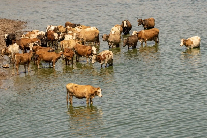 Diyarbakır'da yaz mevsimiyle birlikte etkisini artıran bunaltıcı sıcaklar, hem kent sakinlerini hem de çiftçilerin büyükbaş hayvanlarını zorluyor. Termometrelerin 40 dereceyi aştığı Sur ilçesinde bulunan Kabaklı Gölü, bu günlerde adeta hayvanların doğal serinleme alanına dönüştü.