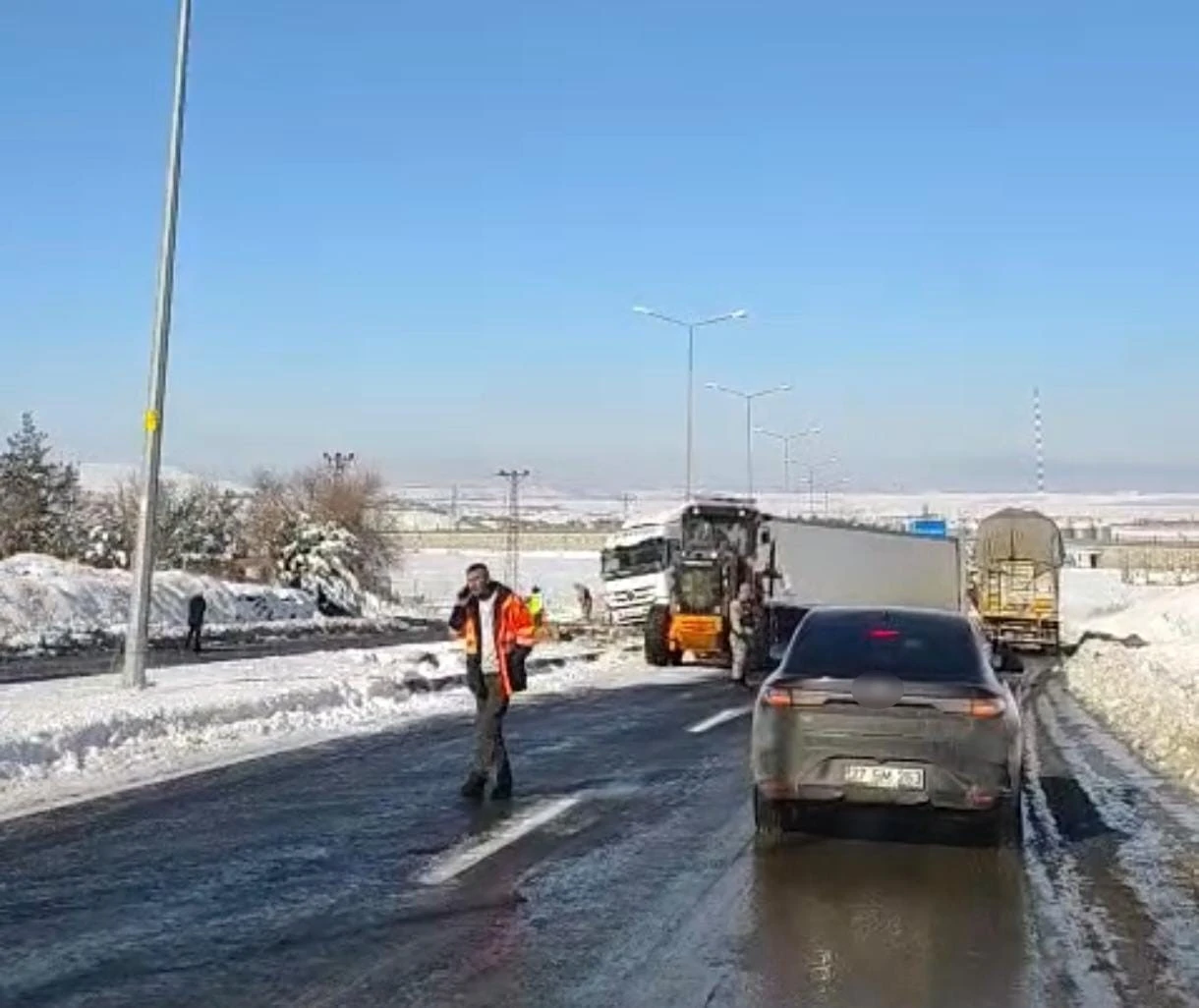 Diyarbakır’da kar yağışı sonrası oluşan buzlanma, ulaşımı olumsuz etkilemeye devam ediyor. Diyarbakır-Mardin kara yolu üzerinde meydana gelen kazada, buzlanan zeminde ilerleyen bir tır sürücüsünün direksiyon hakimiyetini kaybetmesi sonucu yoldan çıktı.