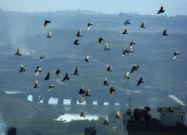Güvercinlerin süzülerek taklalar atması ve rüzgarla uyum içinde dans etmesi, sahipleri için hem bir gurur kaynağı hem de estetik bir seyir zevki oluşturuyor. Bu fotoğraf Gazeteci Mürsel Acay tarafından çekildi. Sur semalarında süzülen bu kuşlar, Diyarbakır’ın simge yapılarından On Gözlü Köprü ile aynı karede buluşunca ortaya büyüleyici görüntüler çıktı.