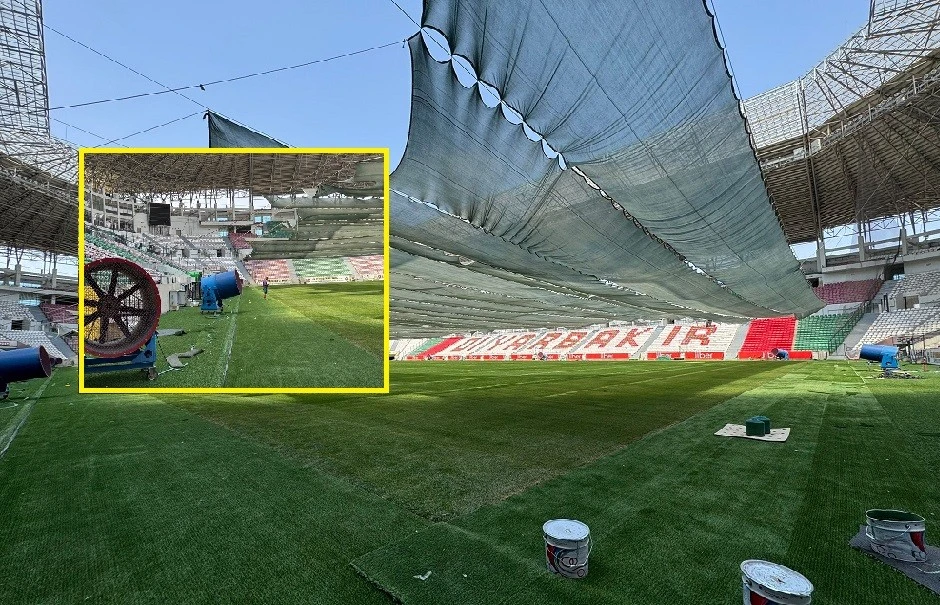 Diyarbakır’da geçtiğimiz günlerde çalışmaları tamamlanan stadyumda, yeşil zeminin dayanıklılığını artırmak için özel önlemler alınıyor. Bölgeyi etkisi altına alan yüksek sıcaklıklar, çimlerin zarar görmesini engellemek amacıyla perdeleme yöntemiyle gölgelendiriliyor.