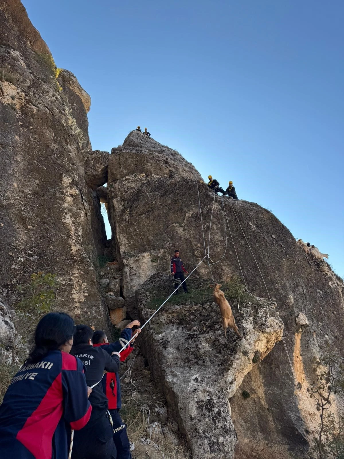 Diyarbakır’ın Eğil ilçesinde, otlanmak için kayalıklara inen 25 keçi, yüksek ve dik alanlarda mahsur kaldı. Besicinin durumu fark etmesi üzerine hemen yetkililere haber verildi. Olay yerine sevk edilen Diyarbakır Büyükşehir Belediyesi İtfaiye ekipleri, keçileri kurtarmak için hızlı bir şekilde harekete geçti.