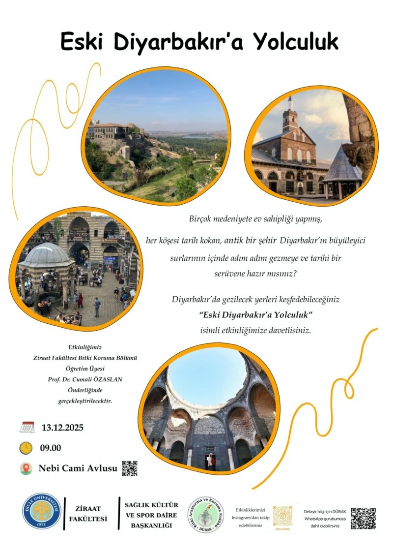 Etkinlik, Ziraat Fakültesi Bitki Koruma Bölümü öğretim üyesi eşliğinde yapılacak ve katılımcılara Diyarbakır’ın geçmişten günümüze uzanan mimari ve kültürel mirası anlatılacak.