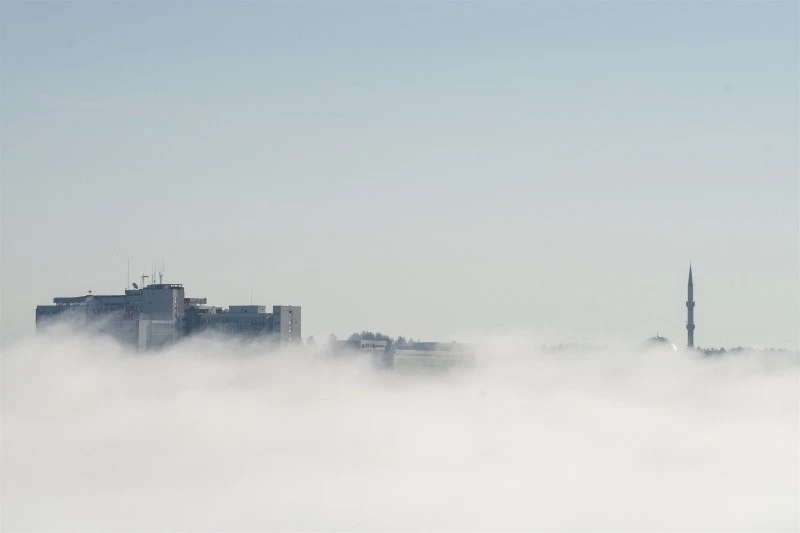 Koleksiyonun dikkat çeken bir diğer yönü ise Diyarbakır’ın modern mimarisinin sis içindeki dönüşümü. Fetih Cami ve Mustafa Uzan Cami gibi yeni dönem yapıları, sisin yumuşatıcı etkisiyle zamansız bir siluet haline gelirken, bazı fotoğraflarda modern hastane ve üniversite blokları sisin arasından yükselen mimari kütleleriyle farklı bir perspektif sunuyor. Yanlarında beliren ince bir minare ise geçmiş ile günümüz arasında görsel bir köprü kuruyor.