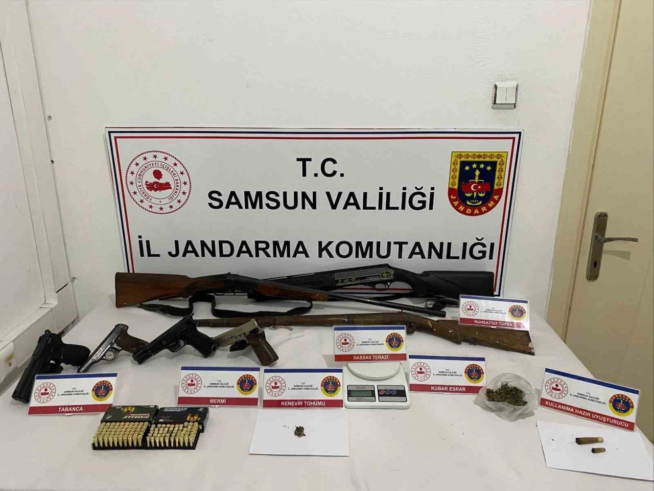 Edinilen bilgiye göre, Samsun’un Salıpazarı ilçesinde jandarma ekipleri tarafından yapılan araştırmalar neticesinde E.T. (34) ve E.A. (43) isimli şahısların ikametlerinde ve iş yerlerinde uyuşturucu madde ve silah bulundurdukları bilgisine ulaşıldı. Salıpazarı İlçe Jandarma Komutanlığı ekiplerince şahısların evlerinde ve iş yerinde arama yapıldı. Yapılan aramalarda, 40 gram kubar esrar, 10 gram kenevir tohumu, 2 adet esrarlı sigara, 1 adet hassas terazi, 2 adet ruhsatsız tabanca, 2 adet ruhsatsız kurusıkı tabanca, 100 adet tabanca fişeği ve 3 adet ruhsatsız av tüfeği ele geçirildi.