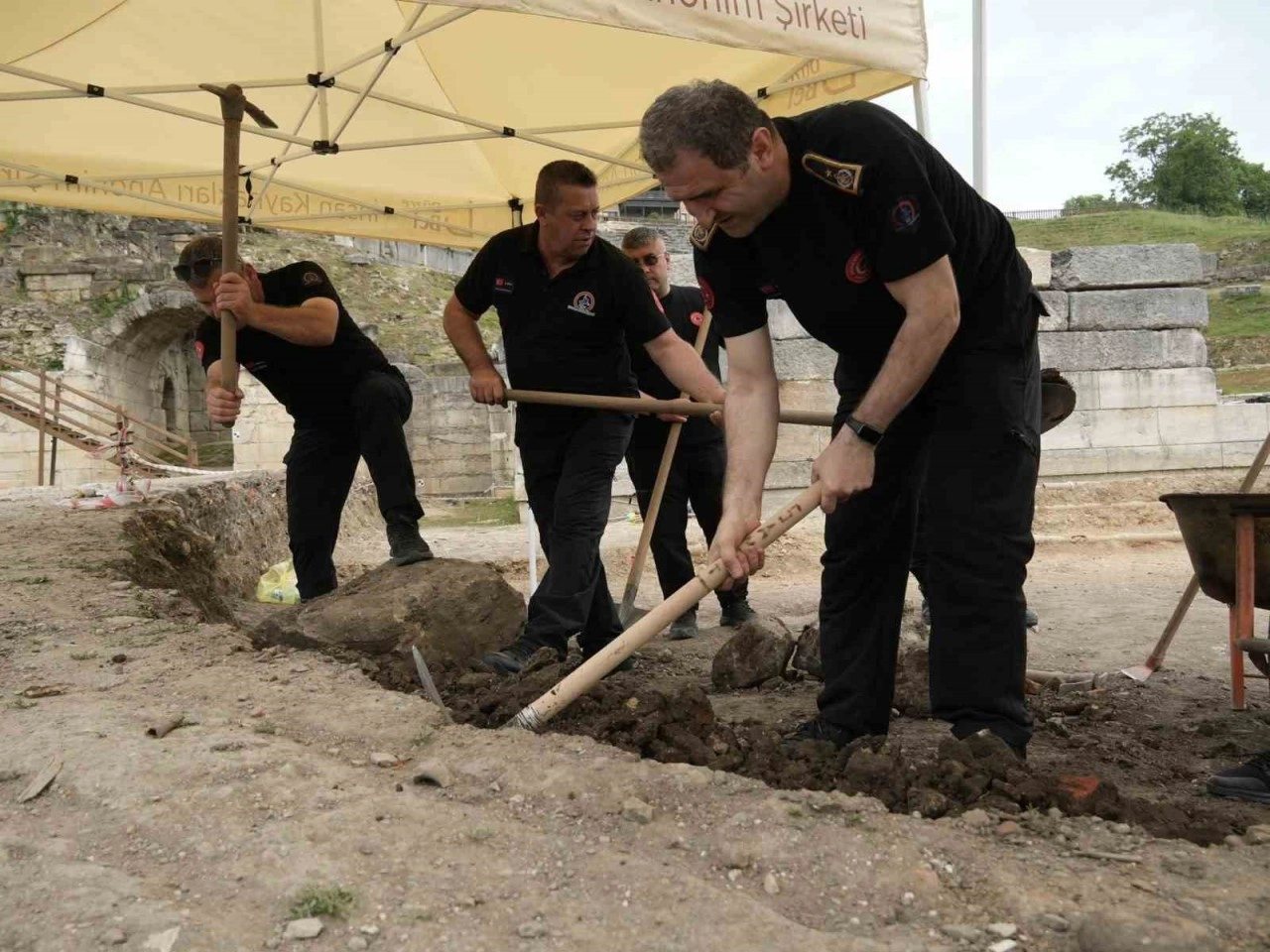 Düzce Belediyesi İtfaiyesi personeli, Düzce’nin ve bölgenin en önemli tarihi ve kültürel miraslarından biri olan Konuralp Antik Tiyatrosu kazılarına katılarak destek verdi.