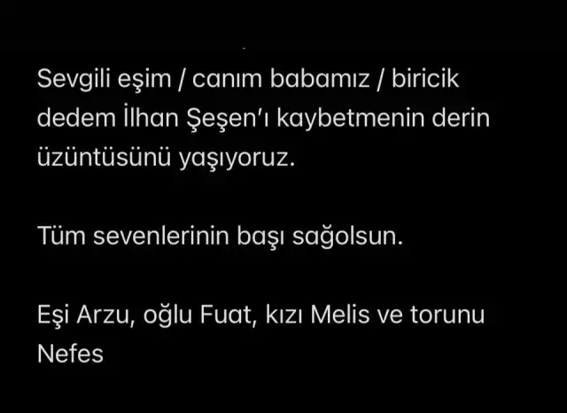 Ünlü sanatçının ailesi, acı haberi sosyal medya üzerinden şu ifadelerle duyurdu:“Sevgili eşim, canım babamız, biricik dedem İlhan Şeşen'i kaybetmenin derin üzüntüsünü yaşıyoruz. Tüm sevenlerinin başı sağ olsun.”