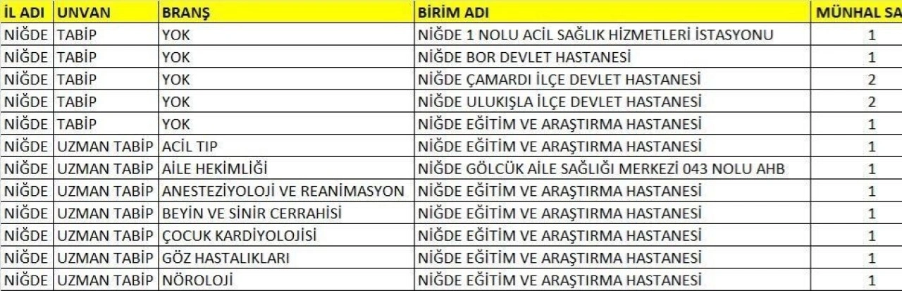 Niğde İl Sağlık Müdürlüğü tarafından yapılan açıklamaya göre, kente 14 yeni uzman ve pratisyen doktor atanacak. Yapılan açıklamada, yeni atamaların Niğde merkez ile birlikte Çamardı, Bor ve Ulukışla ilçelerini kapsayacağı belirtildi. Sağlık alanında ihtiyaç duyulan birçok branşta gerçekleştirilecek atamalarla birlikte, bölge halkının sağlık hizmetlerine erişiminin kolaylaşması ve hizmet kalitesinin artırılması hedefleniyor. Atanacak doktorların görev yapacağı branşlar ise şöyle sıralandı; Anesteziyoloji ve Reanimasyon, Beyin ve Sinir Cerrahisi, Çocuk Kardiyoloji, Göz Hastalıkları, Nöroloji, Aile Hekimliği, Acil Tıp kadrosuna atamalar gerçekleştirildi.