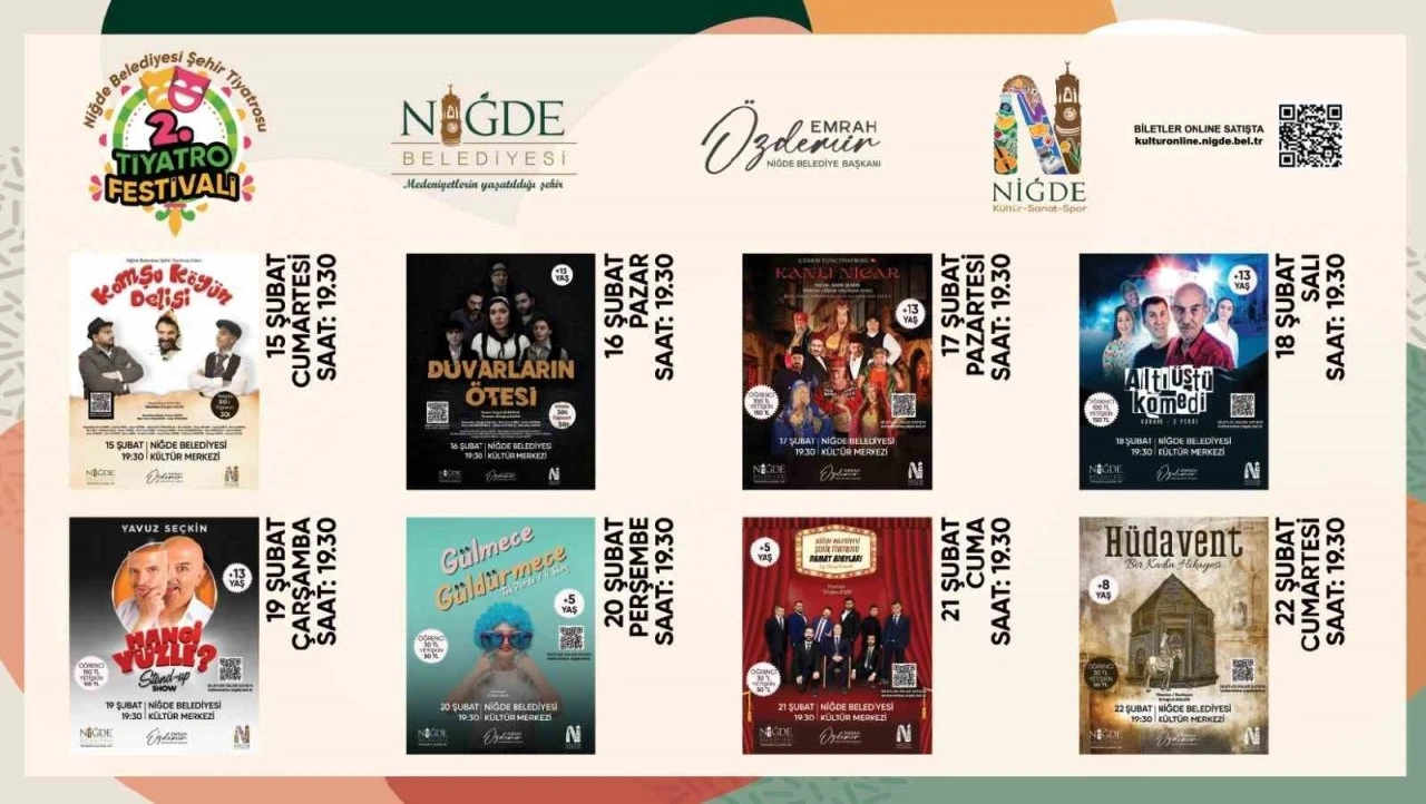 Festival, 15-22 Şubat 2025 tarihleri arasında gerçekleşecek. Tüm oyunlar, Niğde Belediyesi Kültür Merkezi’nde saat 19.30’da sahnelenecek. Sanatseverler hem usta tiyatrocuların sahnelediği oyunları hem de Niğde Belediyesi Şehir Tiyatrosu’nun özel gösterimlerini izleme fırsatı bulacak. Festivalde sahnelenecek tüm oyunlara giriş için biletler, kulturonline.nigde.bel.tr adresinden veya Niğde Belediyesi Kültür Merkezi gişelerinden temin edilebilecek. Niğde Belediyesi, şehrin kültürel yaşamını zenginleştirmeye devam ediyor. Tiyatro Festivali sayesinde vatandaşlar, sanatın büyülü dünyasında keyifli vakit geçirirken, Niğde’nin kültürel mirasına da katkıda bulunacaklar. Başkan Emrah Özdemir, festivalin Niğde için önemli bir kültürel etkinlik olduğunu belirterek, tüm vatandaşları tiyatronun büyülü dünyasına adım atmaya davet ederek; "Gelin, hep birlikte sanatın tadını çıkaralım!" diyerek sözlerini tamamladı. Festivalin programı şu şekilde: