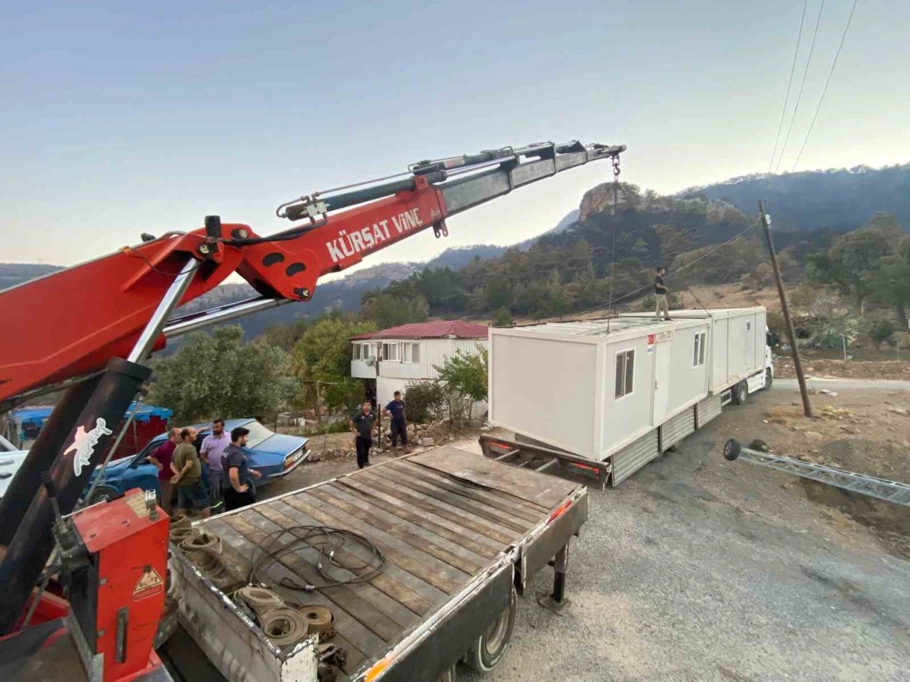 Mersin’in Silifke ilçesinde 3 gün boyunca havadan ve karadan binden fazla personelin müdahalesiyle söndürülen orman yangını sonrasında evleri zarar gören aileler için gönderilen konyetnerler yerleşirilmeye başlandı.