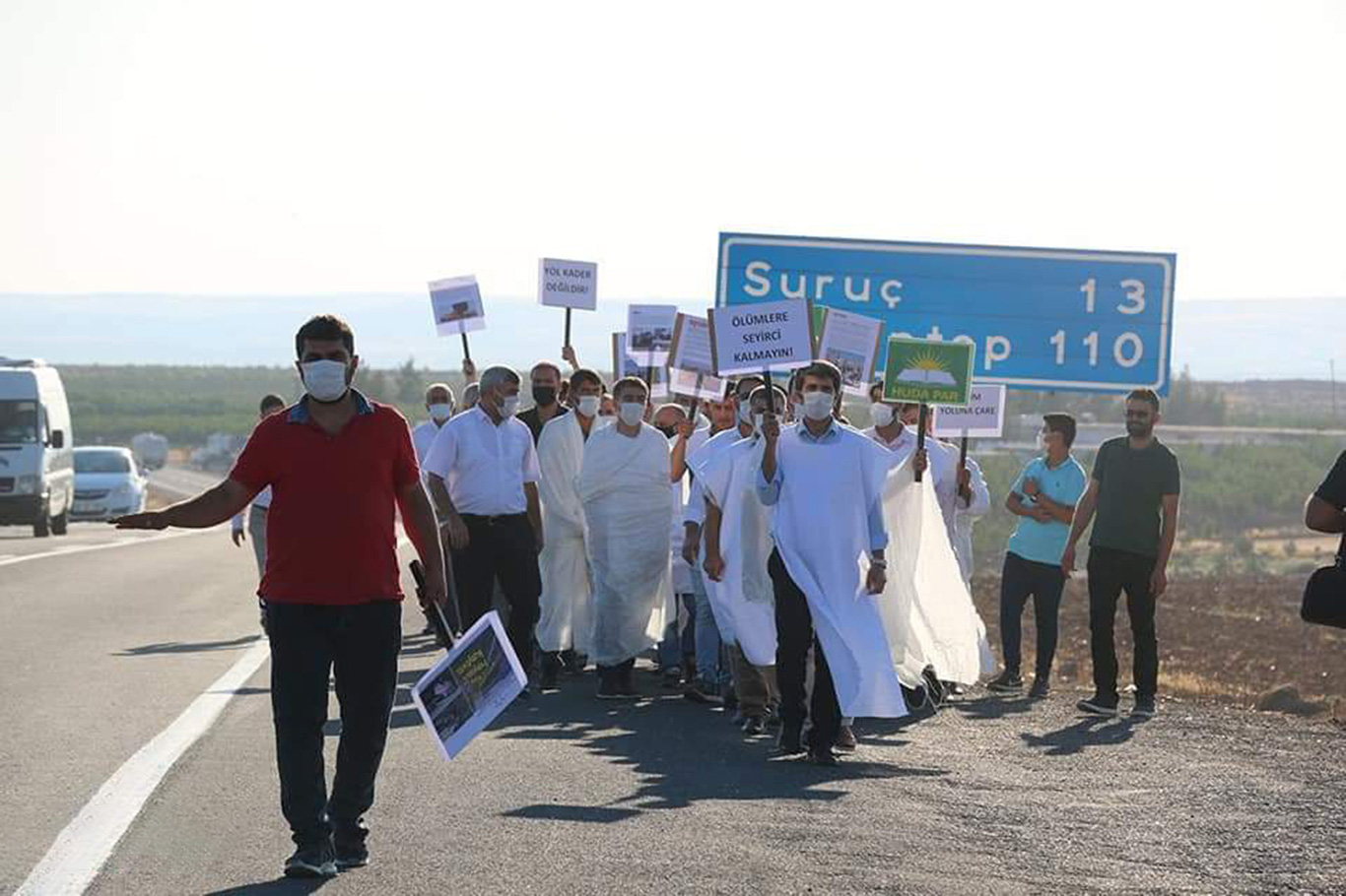 HÜDA PAR Şanlıurfa İl Başkanlığı, daha önce de kara yolundaki kazalara dikkat çekmek amacıyla kefen giyerek kara yolunda yürümüştü.