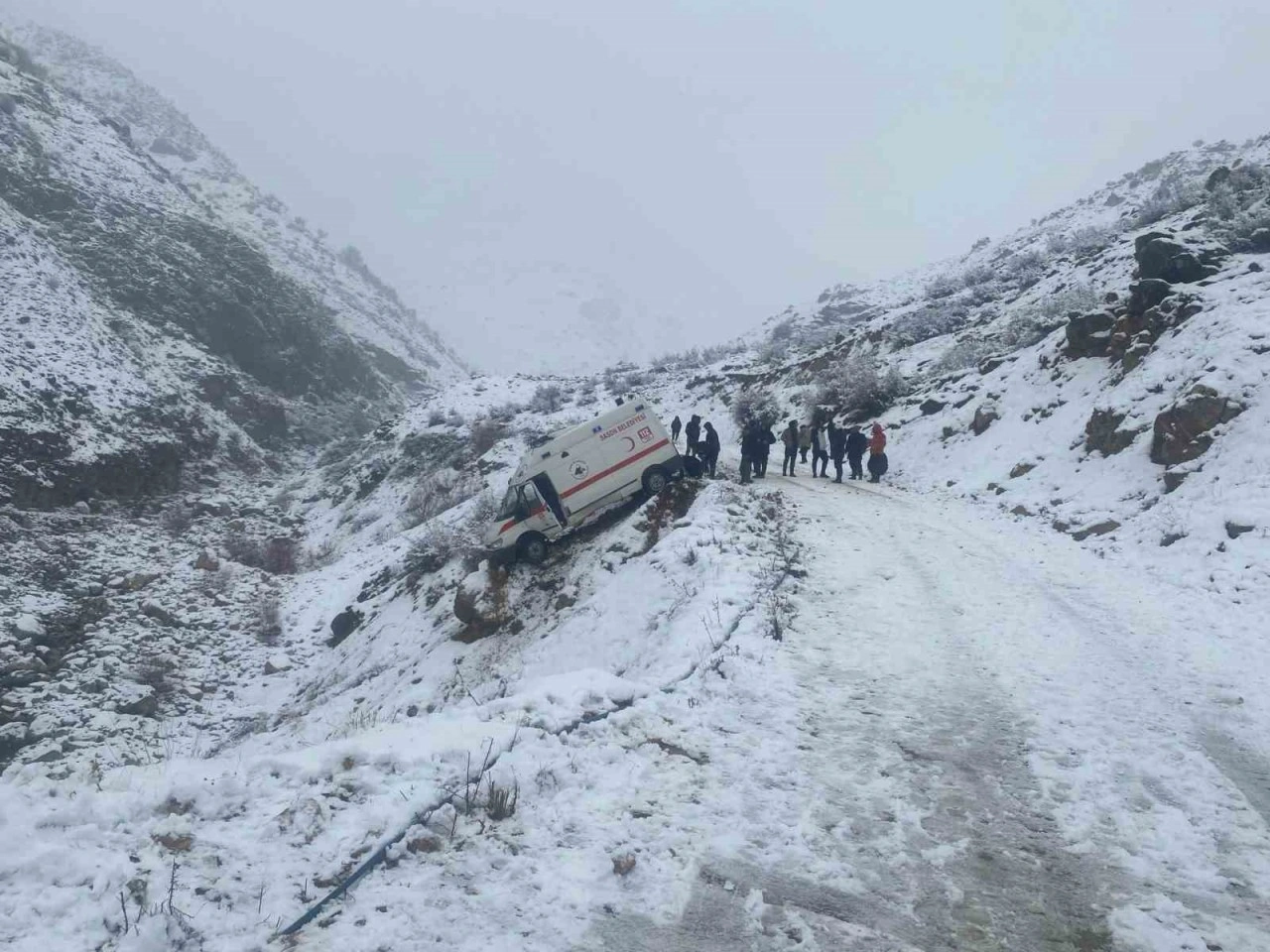 Yoğun kar yağışının devam ettiği Batman’ın Sason ilçesinde hayatını kaybeden 75 yaşındaki kadının cenazesini ilçeye bağlı Çalışırlar köyüne ulaştıran belediyeye ait cenaze taşıma aracı, yoğun kar yağışı nedeniyle kayganlaşan yolda sürücüsü Engin Yaşar’ın kontrolünden çıktı. Sürücü son anda atlayarak kurtulurken, araç uçurumun kenarında kaldı.